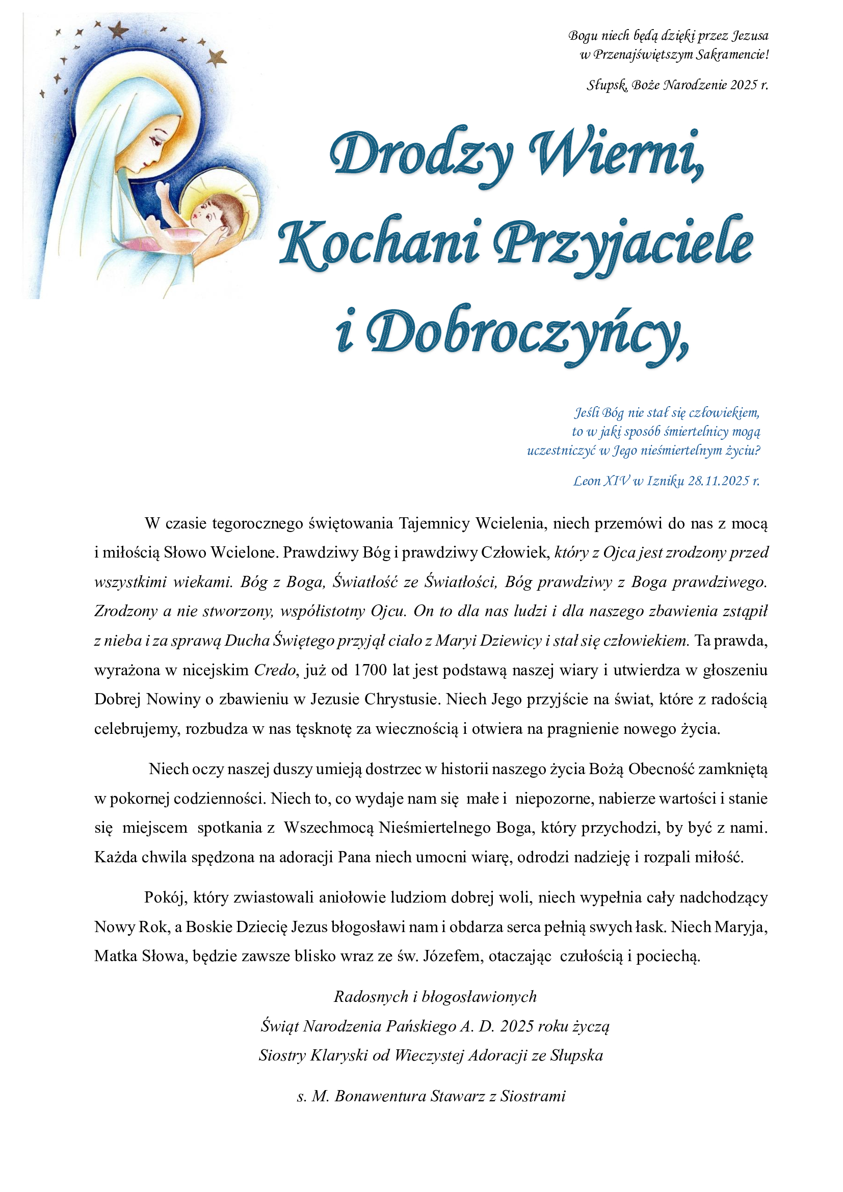 Kochani, w tym szczególnym czasie, pragniemy wyrazić naszą duchową łączność ze Wszystkimi naszymi Bliskimi, Przyjaciółmi i Dobroczyńcami. Z okazji Świąt Narodzenia Pańskiego, duchowo dzieląc się opłatkiem, życzymy wielu łask od Nowonarodzonego Pana.