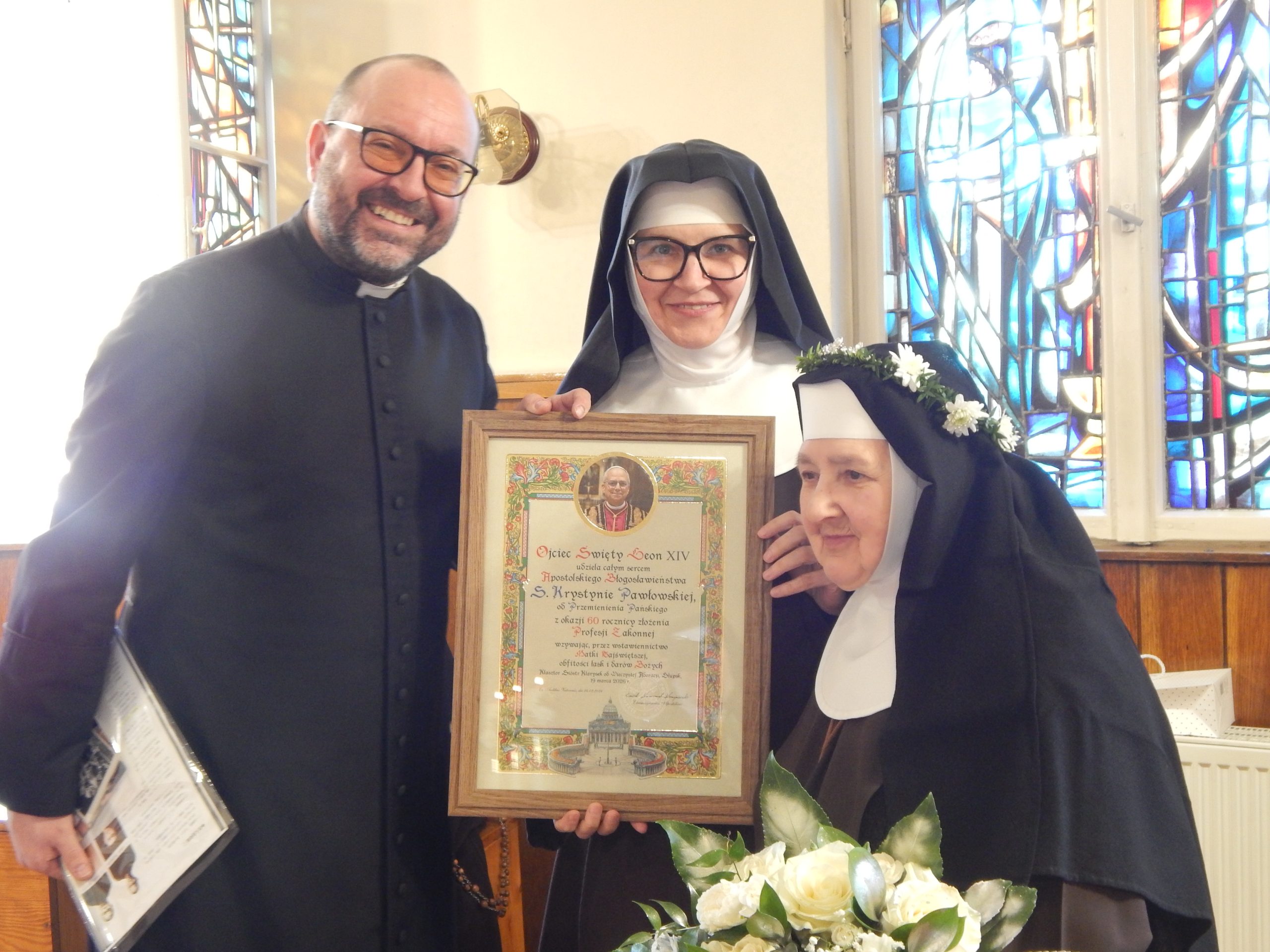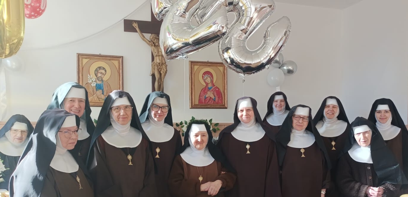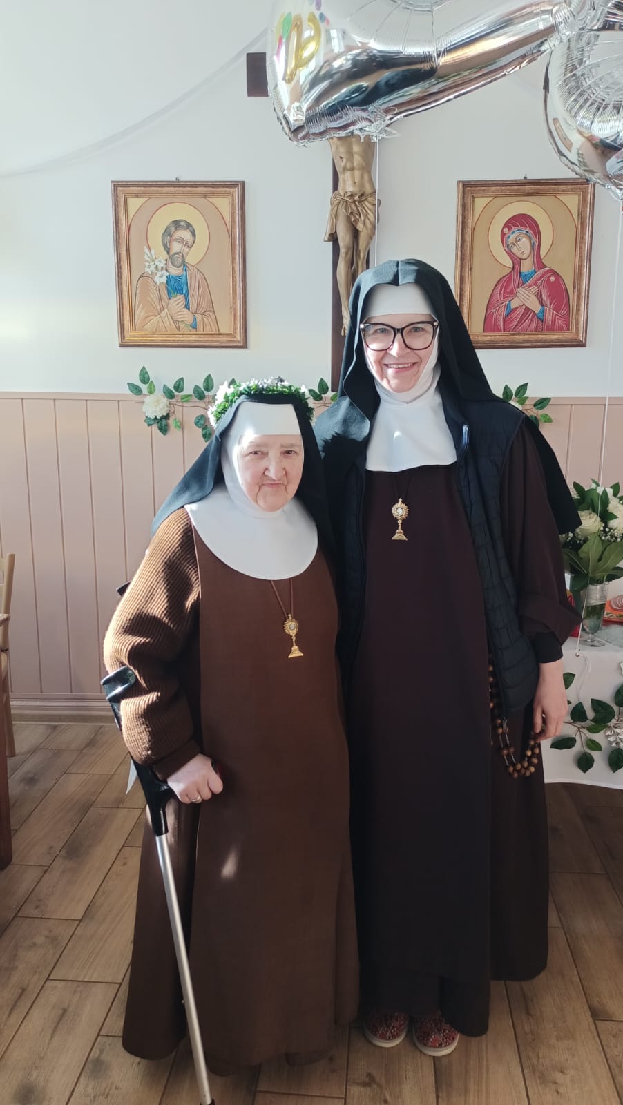 W sobotnie przedpołudnie, 21 marca, w naszej klauzurowej kaplicy uczestniczyłyśmy we Mszy św., która była naszym dziękczynieniem za 60 lat ślubów zakonnych s. M. Krystyny od Przemienienia Pańskiego. Uroczystą Eucharystię sprawował ks. Andrzej Pawłowski – wikariusz słupskiej parafii pw. św. Maksymiliana M. Kolbego, a prywatnie – bratanek naszej Jubilatki.