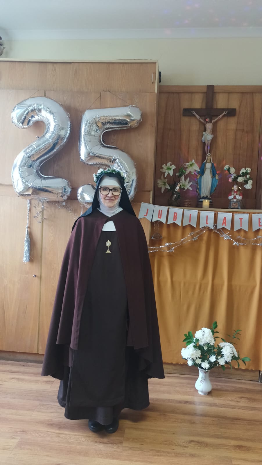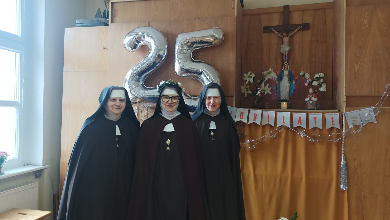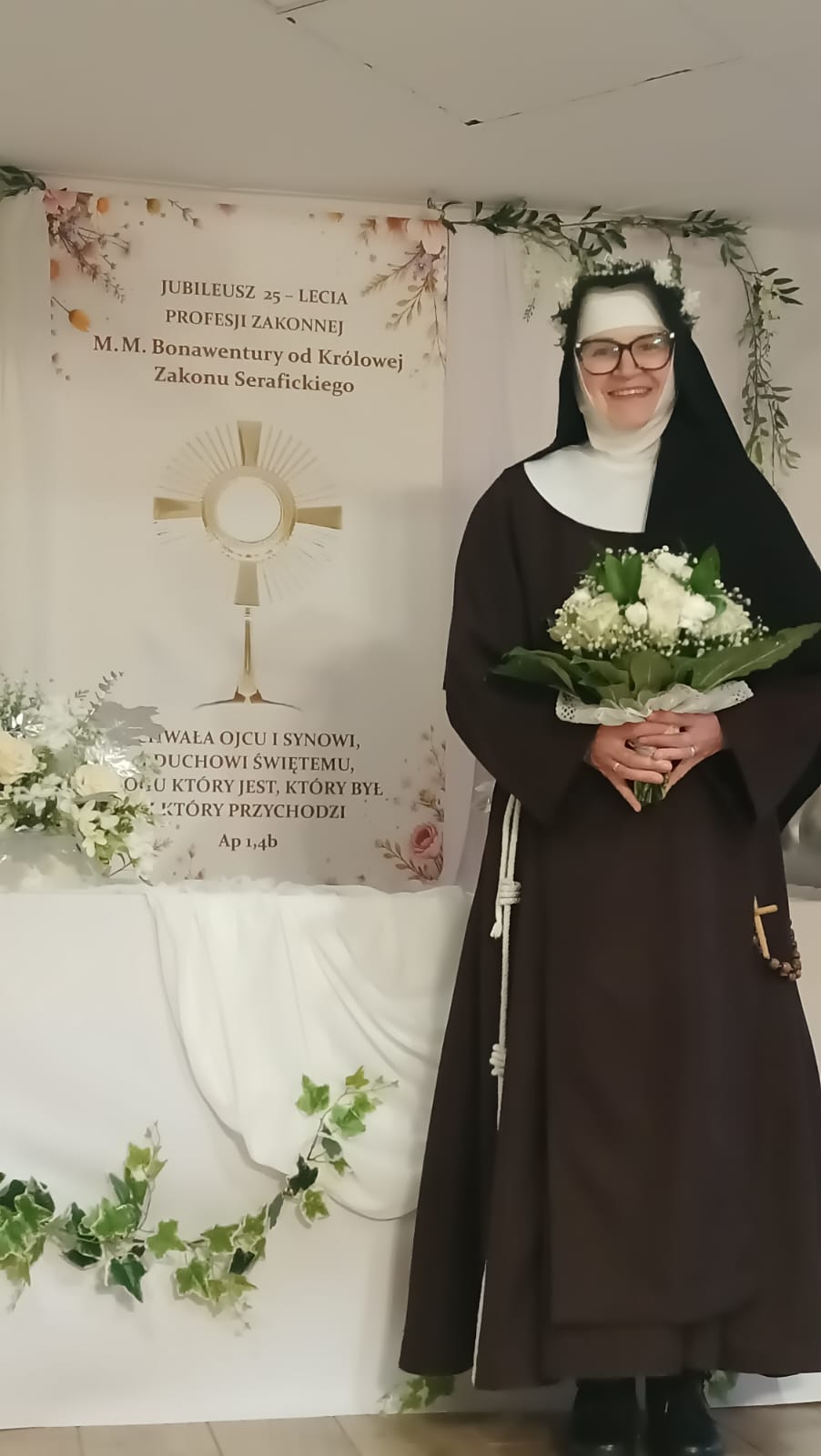 My również składamy Drogiej Jubilatce najserdeczniejsze życia, włączając się we wspólne dziękczynienie za dar życia, powołania i posługi w Zakonie, za 25 lat wyboru najlepszej „cząstki, której nie będzie pozbawiona”. To droga ukryta, a zarazem pełna światła; droga ubóstwa, które staje się bogactwem; droga ciszy, która rodzi Słowo; droga ofiary, która przemienia się w miłość. Święty Bonawentura zostawił nam myśl, że „nie ma innej drogi, jak tylko przez żarliwą miłość do Ukrzyżowanego”. Wpatrując się w przykład świętej Klary, która „trzymała się Chrystusa ubogiego i ukrzyżowanego”, uczymy się logiki Ewangelii: „wszystko uznać za stratę ze względu na najwyższą wartość poznania Chrystusa Jezusa”. Ta miłość dojrzewa każdego dnia w ciszy adoracji – gdy wpatrujesz się w Jezusa ukrytego w Najświętszym Sakramencie, jak w Oblubieńca, który pozostał z nami, abyśmy my mogli być z Nim. Niech serce Kochanej Jubilatki zawsze pozostaje przy Sercu Umiłowanego – czy droga prowadzi wśród słonecznych promieni czy osnuta jest mgłą. Z serca życzymy, aby Ten, który rozpoczął to dobre dzieło, sam go dopełnił. Niech Pan obdarza pokojem, który przewyższa wszelki rozum. Niech Eucharystyczny Chrystus będzie siłą, światłem i radością. Niech prowadzi Czcigodną Jubilatkę napełniając swoją mądrością i bogactwem wszelkich cnót. Dołączając do życzeń bukiet siostrzanej modlitwy, polecamy Kochaną Jubilatkę Maryi – Pokornej Służebnicy Pańskiej i Królowej Zakonu Serafickiego – aby otaczała swoją czułą opieką. Niech Pan będzie uwielbiony w życiu Czcigodnej Jubilatki – dziś i na wieki. Amen!