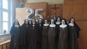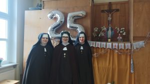 Uroczystość św. Józefa, Oblubieńca NMP, była w tym roku dla nas szczególnie świątecznym dniem. O godz. 11.00 celebrowałyśmy 25-lecie ślubów zakonnych N.W. Matki M. Bonawentury. Po ceremonii w klasztorze, procesją ze śpiewem maryjnego hymnu Magnificat, odprowadziłyśmy naszą Przełożoną do kościoła. Świątecznej Eucharystii przewodniczył brat N.W. Matki, ks. Krzysztof Stawarz. Przy ołtarzu obecni byli również solenizanci tego dnia – nasz ks. kapelan Józef Kwieciński i ks. Józef Domińczak, proboszcz słupskiej parafii pw. św. Józefa – a także: o. Janusz Jędryszek OFMConv, ks. Zygmunt Halejcio, ks. Dawid Andryszczak, ks. Jan Wojtczak oraz znajomy Jubilatki ks. Tomasz z diecezji rzeszowskiej. W uroczystości udział wzięła również najbliższa rodzina N.W. Matki, Rodzice, brat oraz Przyjaciele i Znajomi. Przyjechała również s. M. Rafaela – przedstawicielka wspólnoty z Kęt, skąd przybyła do nas Droga Jubilatka.