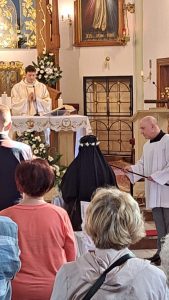Przed uroczystą Mszą św. zebrałyśmy się w naszej Izbie Zgromadzenia, a potem ze śpiewem Magnificat odprowadziłyśmy naszą Siostrę do kościoła. O godz. 10.00 rozpoczęła się Eucharystia, której przewodniczył ks. dr Jan Wojtczak – wikariusz parafii pw. NSJ, na terenie której znajduje się nasz klasztor – kapłan, podobnie jak s. M. Weronika, pochodzi z kołobrzeskiej parafii konkatedralnej. Przy ołtarzu obecny był także nasz ks. kapelan Józef Kwieciński. W kościele zgromadziła się Rodzina, Przyjaciele i Znajomi Siostry Jubilatki. Liturgię ubogacili zaprzyjaźnieni muzycy pięknym śpiewem i grą.