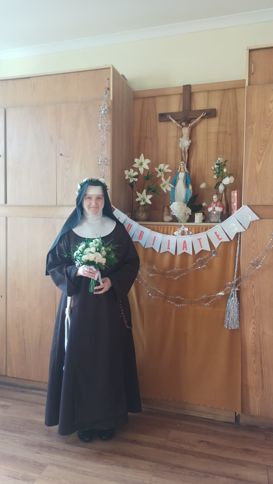 A my naszej Kochanej Jubilatce, dziękując za to, że jesteś z nami, dziękując za wszystkie dary, jakimi ubogacasz, Kochana Siostro, naszą Wspólnotę, Zakon i cały Kościół Święty, życzymy, aby Boski Oblubieniec zawsze był dla Czcigodnej Jubilatki życiem i pokojem. Niech Ojciec miłosierdzia obdarza Cię nieustanną radością z daru powołania – czy szlak będzie wiódł przez ukwieconą łąkę czy spowitą mgłą dolinę. Niech miłość Jezusa Chrystusa będzie Twoją siłą i kotwicą. Niech Duch Święty podtrzymuje w Najmilszej Siostrze żywą nadzieję