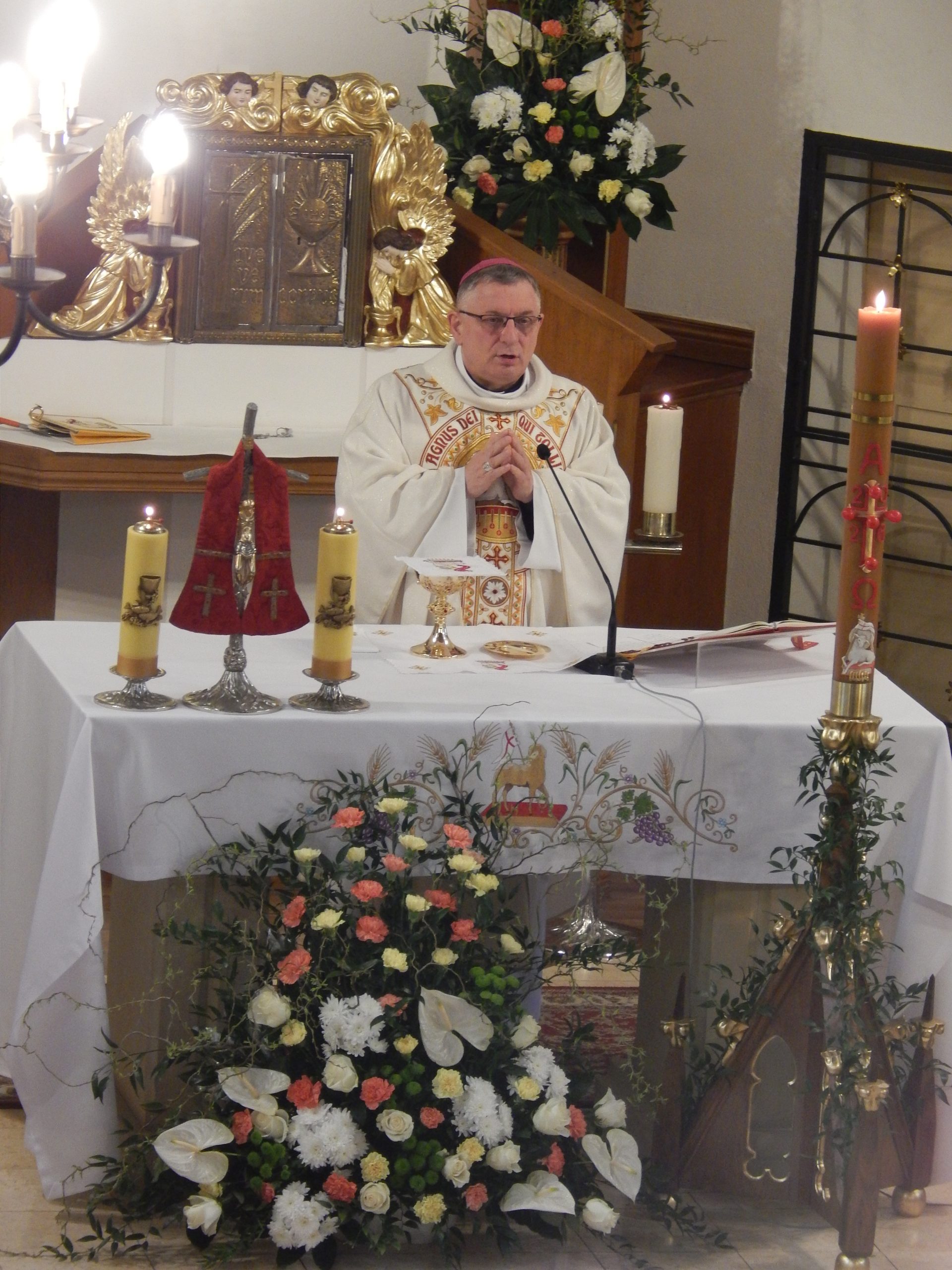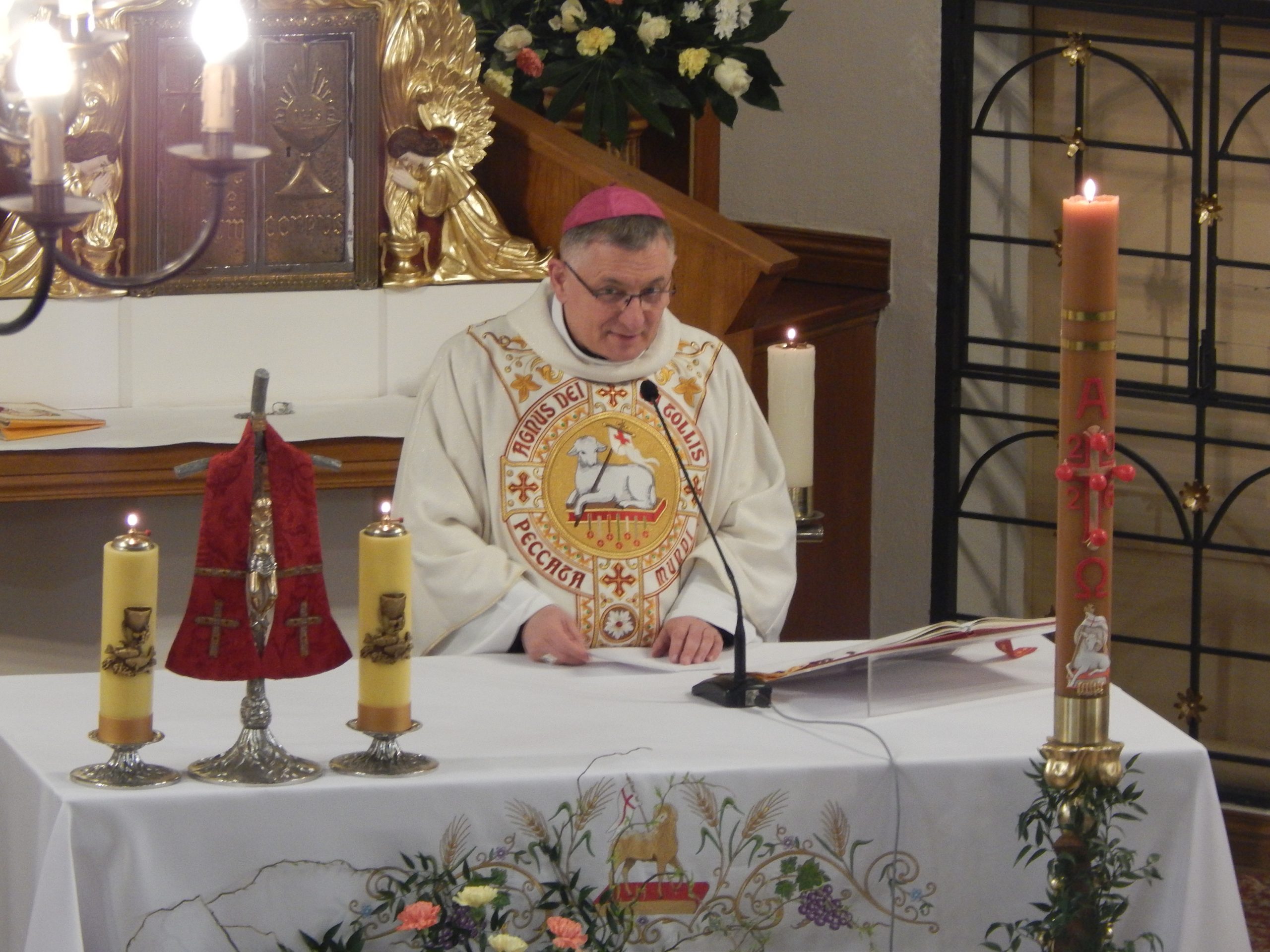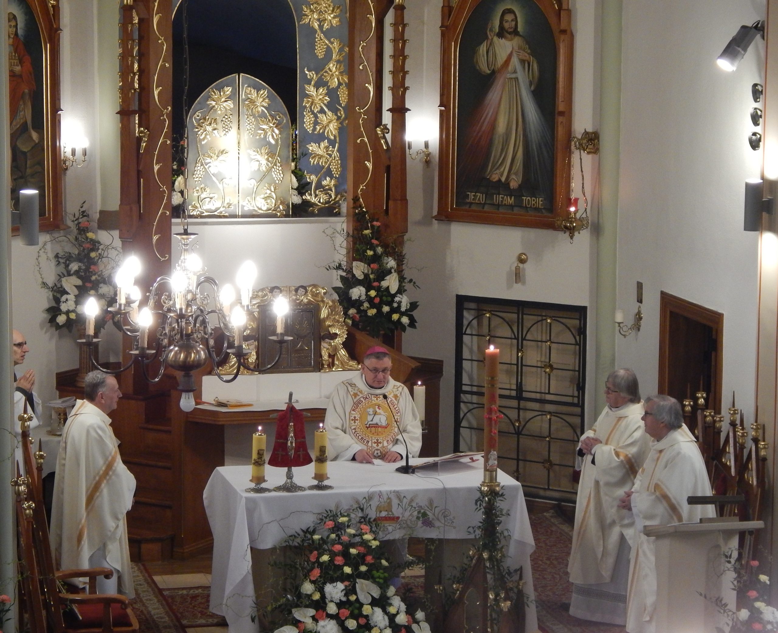 W Wielkanocny Poniedziałek wieczornej Mszy św. w naszym kościele przewodniczył J.E. bp Krzysztof Zadarko. Była to jego pierwsza wizyta u nas po nominacji na ordynariusza diecezji. Przy Chrystusowym ołtarzu obecni byli również: ks. Jerzym Urbański, proboszcz parafii pw. NSJ, na terenie której znajduje się nasz klasztor; ks. Józef Domińczak, proboszcz parafii pw. Św. Jacka oraz nasz ks. Kapelan Józef Kwieciński.