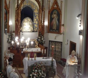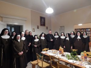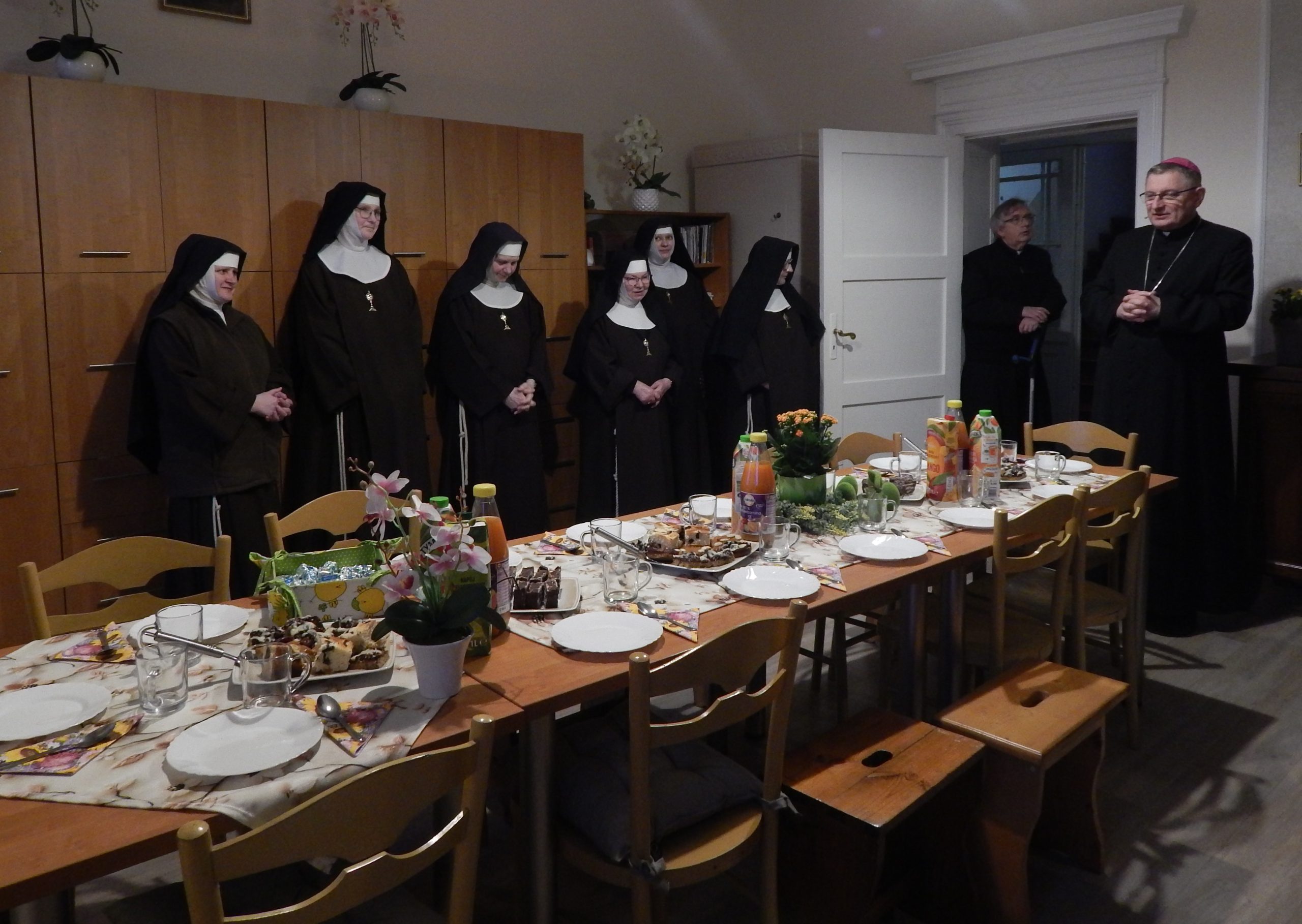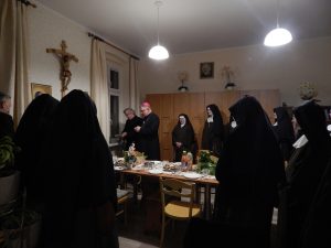 Po Eucharystii miała jeszcze miejsce wspólna modlitwa do Bożego Miłosierdzia w kolejnym dniu nowenny. Natomiast po liturgii, Biskup wraz z ks. Proboszczem Jerzym i naszym ks. Kapelanem weszli do klauzury, gdzie Pasterz naszej diecezji poświęcił salę nowicjatu i dormitarz po dopiero co ukończonym remoncie. Tam także miało miejsce nasze spotkanie i pogodna rekreacja zakończona Apelem Jasnogórskim.